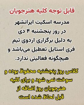 Posted on 3 دی 1404 اخبار قابل توجه کلیه هنرجویان مدرسه اسکیت ایرانشهر در روز پنجشنبه ۴ دی به دلیل برگزاری اردوی تیم فری استایل تعطیل میباشد و هیچگونه فعالیتی ندارد.کلاس روز پنجشنبه محفوظ بوده و سوخت نمی شود و برای کلیه هنرجویان روز اضافه از قبل لحاظ شده است.